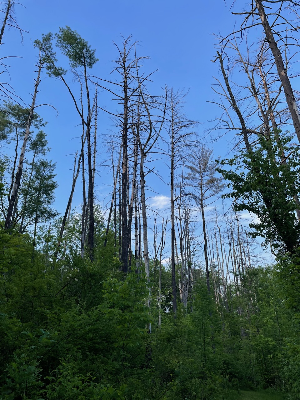 On the way down the last steep slope I can hear the waves rushing. After trying to explain inosculated trees to some painters here and sounding like a knowitall jerk I come across a pair right by the side of the trail here, a young white ash and a hophornbeam, seemingly making out.