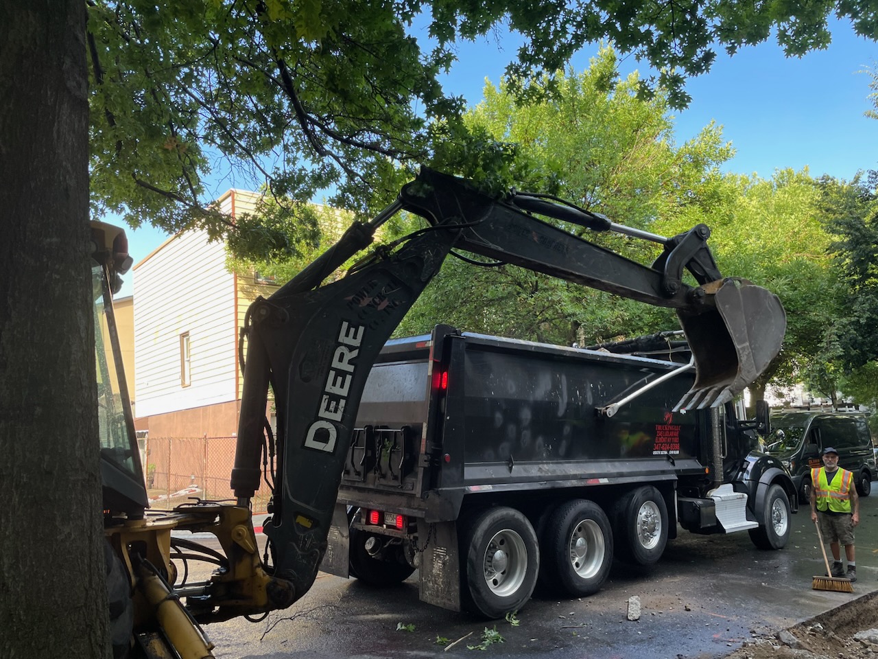 The machine driver removes some of the sidewalk, then lands his bucket with a thump on the fill, banging the ground close to Mike, the person in charge of saw-cutting concrete before excavation begins.