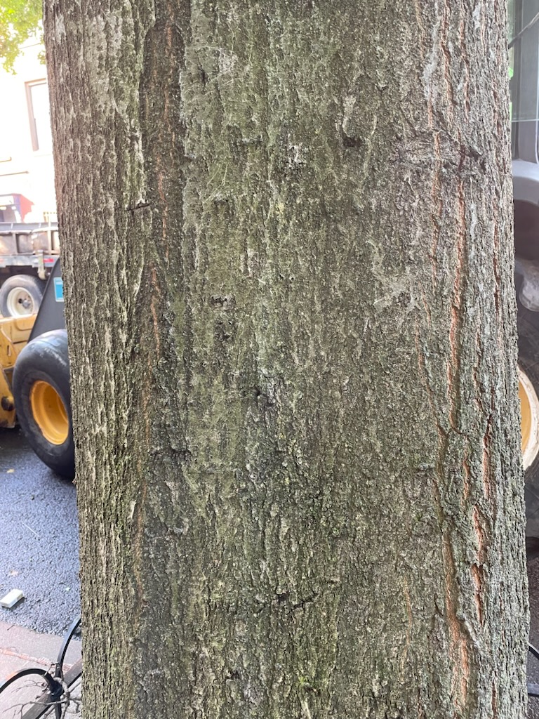 It occupies a tiny tree pit, 5×5, the base of its trunk flowing out to the edge of the pit, which was once carefully laid with Belgian blocks.