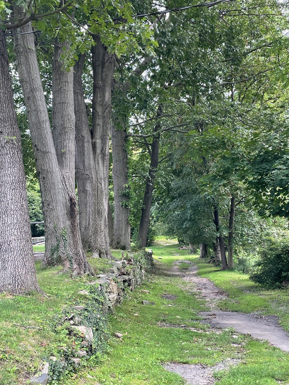 The stone walls along the allee tell a story, as stone walls always do. In this case, probably a talel of immigrant stone masons wanting to make good in America. They risked their lives to provide pure drinking water to families like the Minturns.