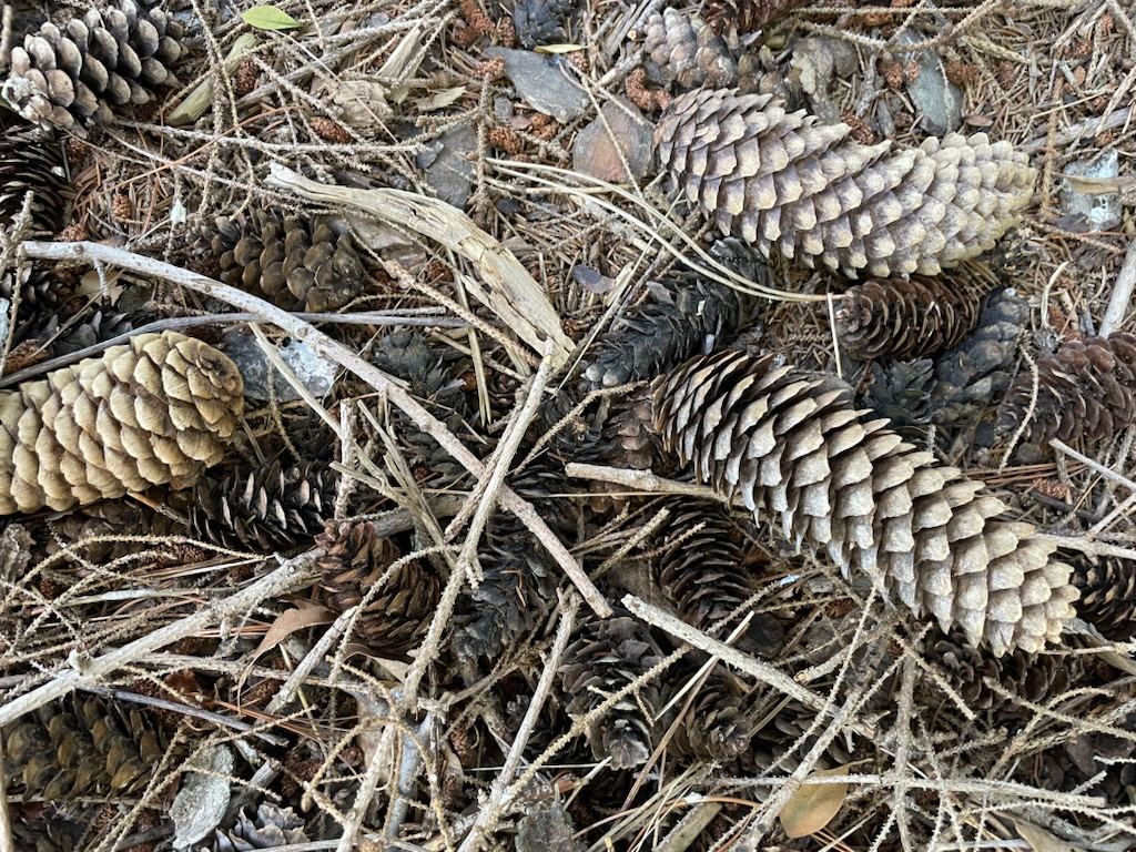 Cones litter the ground, brown on brown.