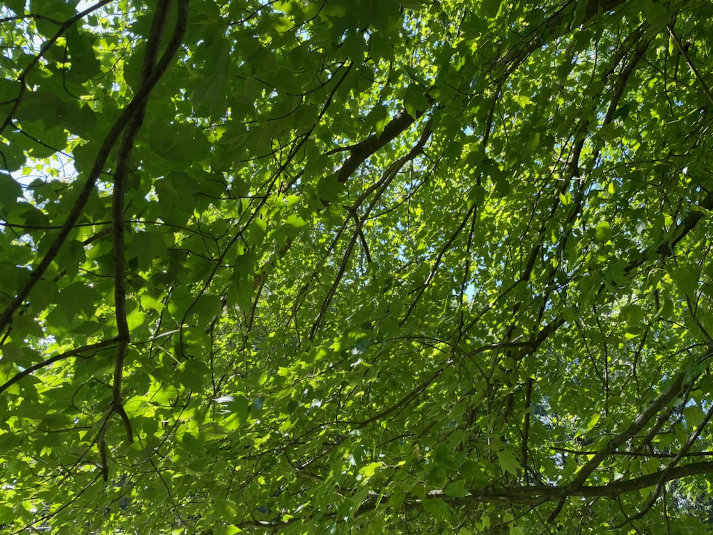 Outside, the emerald glow of a red maple canopy.