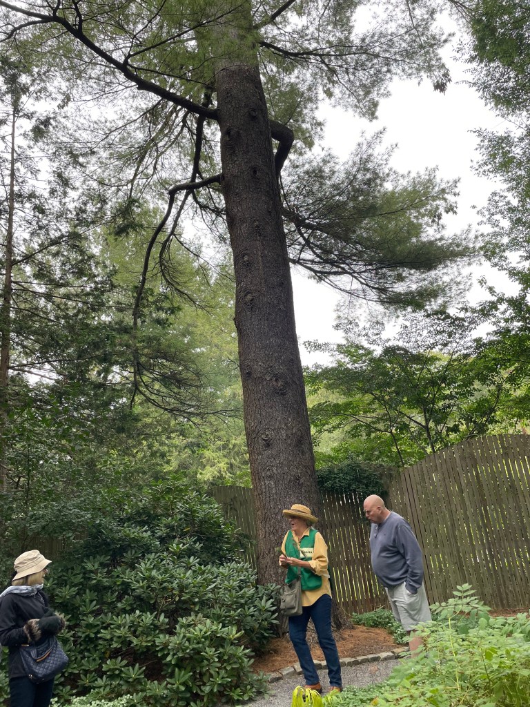 It is neither tulip nor poplar. But it is the tallest tree native to this region. Liriodendron tulipifera, she tells us, has musical instrument-shaped leaves and tulip-shaped flowers. This particular specimen is equipped with lightning rods that don’t happen to be attached to its ground rod.