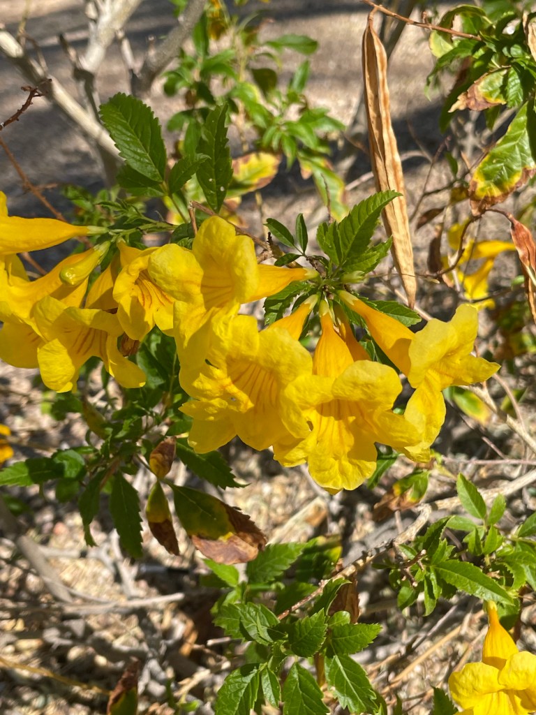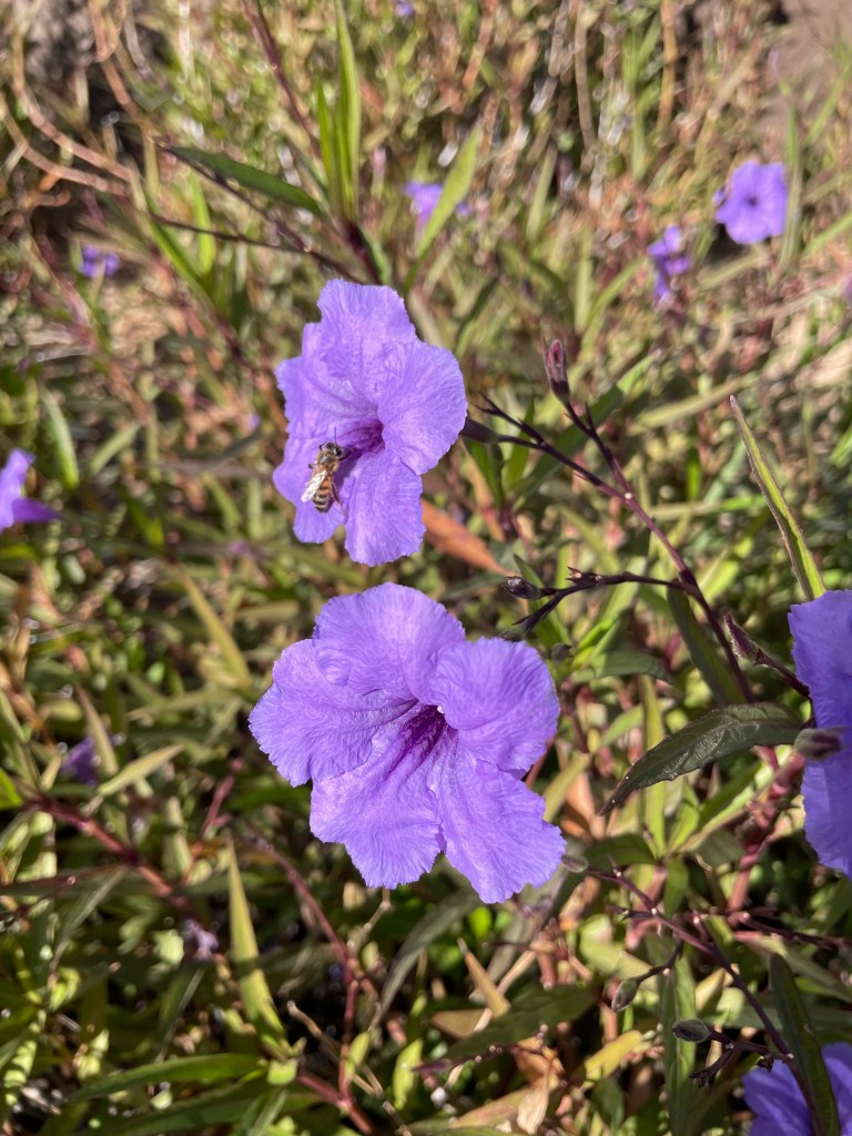 Not totally alone. Communing with a bee on the Mexican petunia. Mexican petunia? Invasive! Who cares? Not me, at the moment.