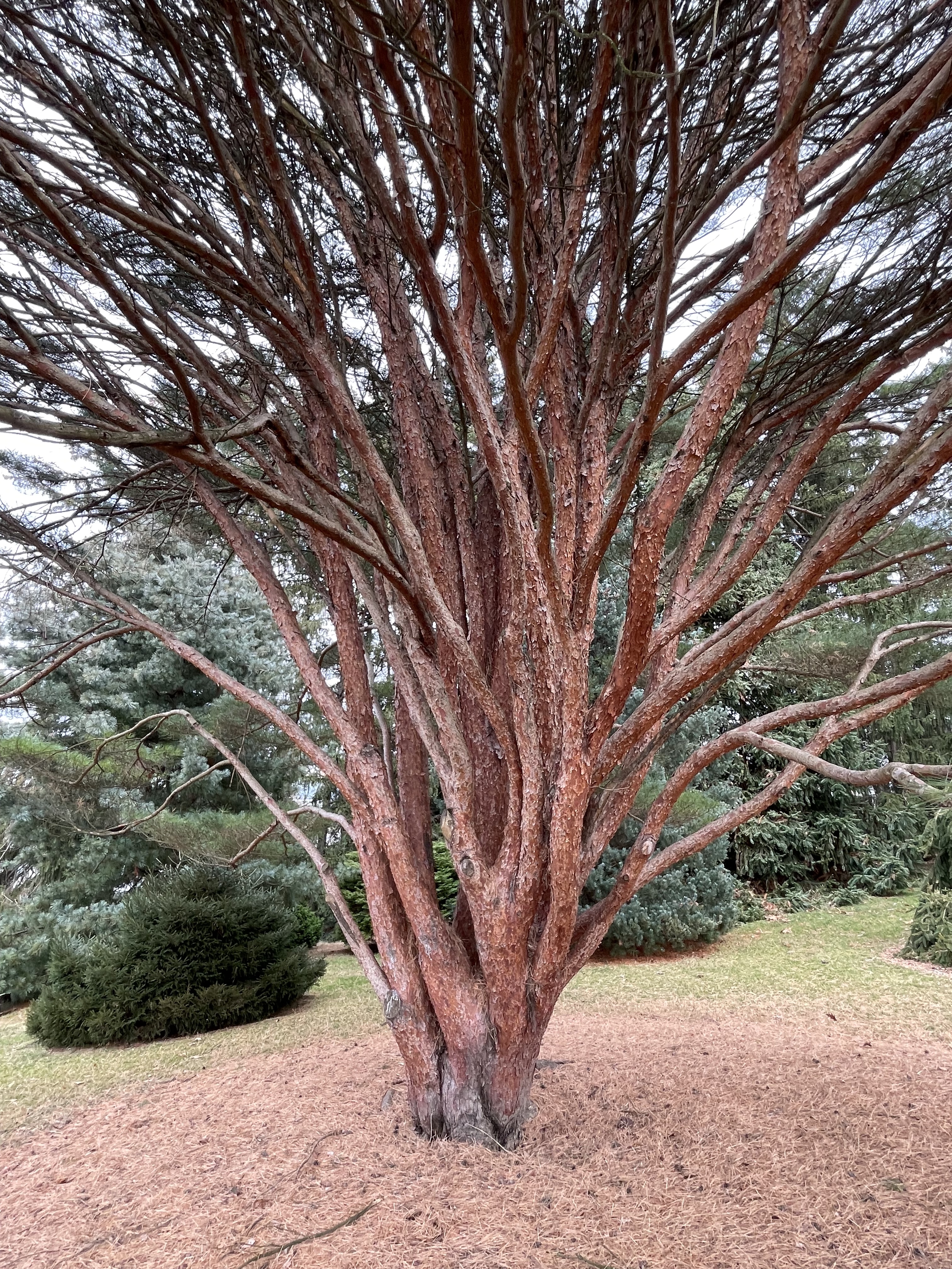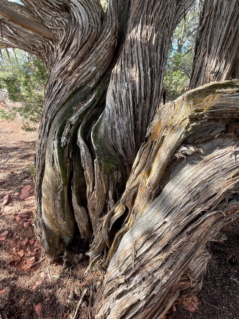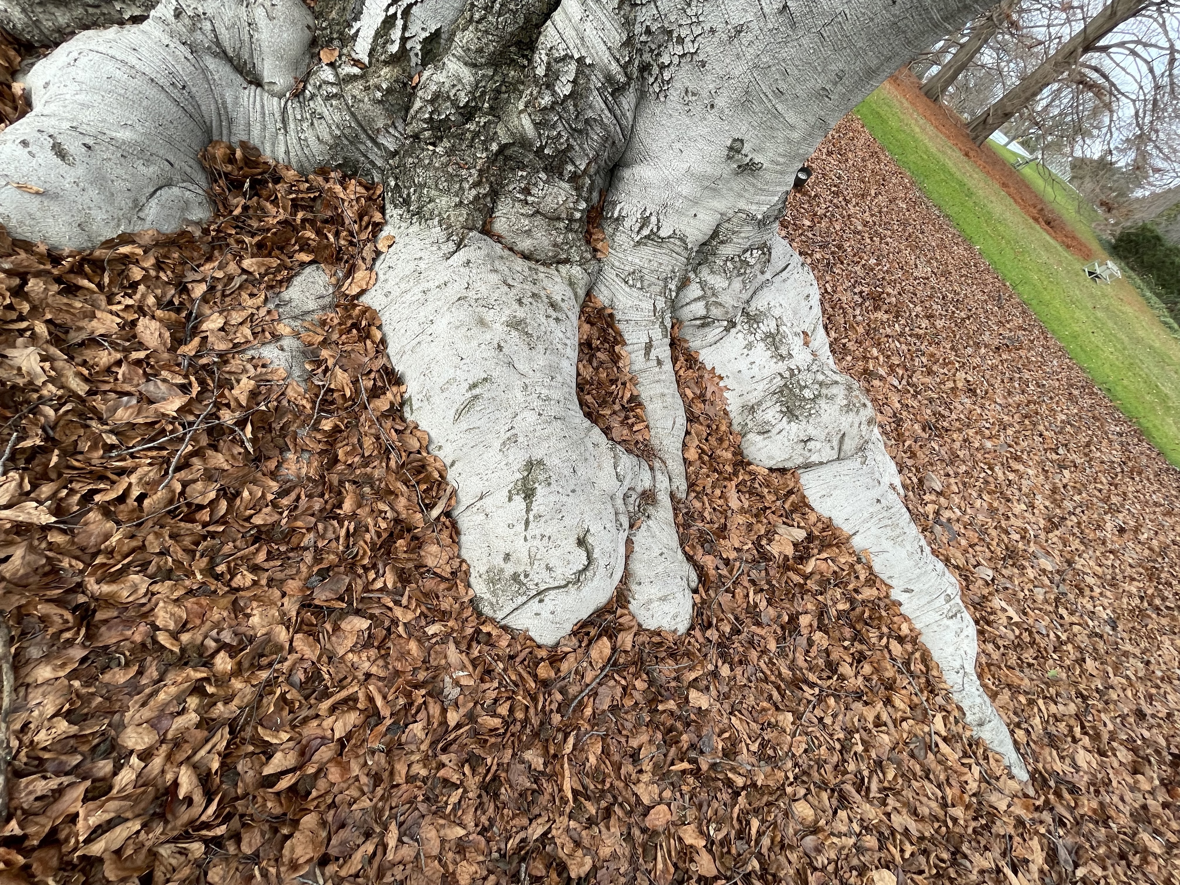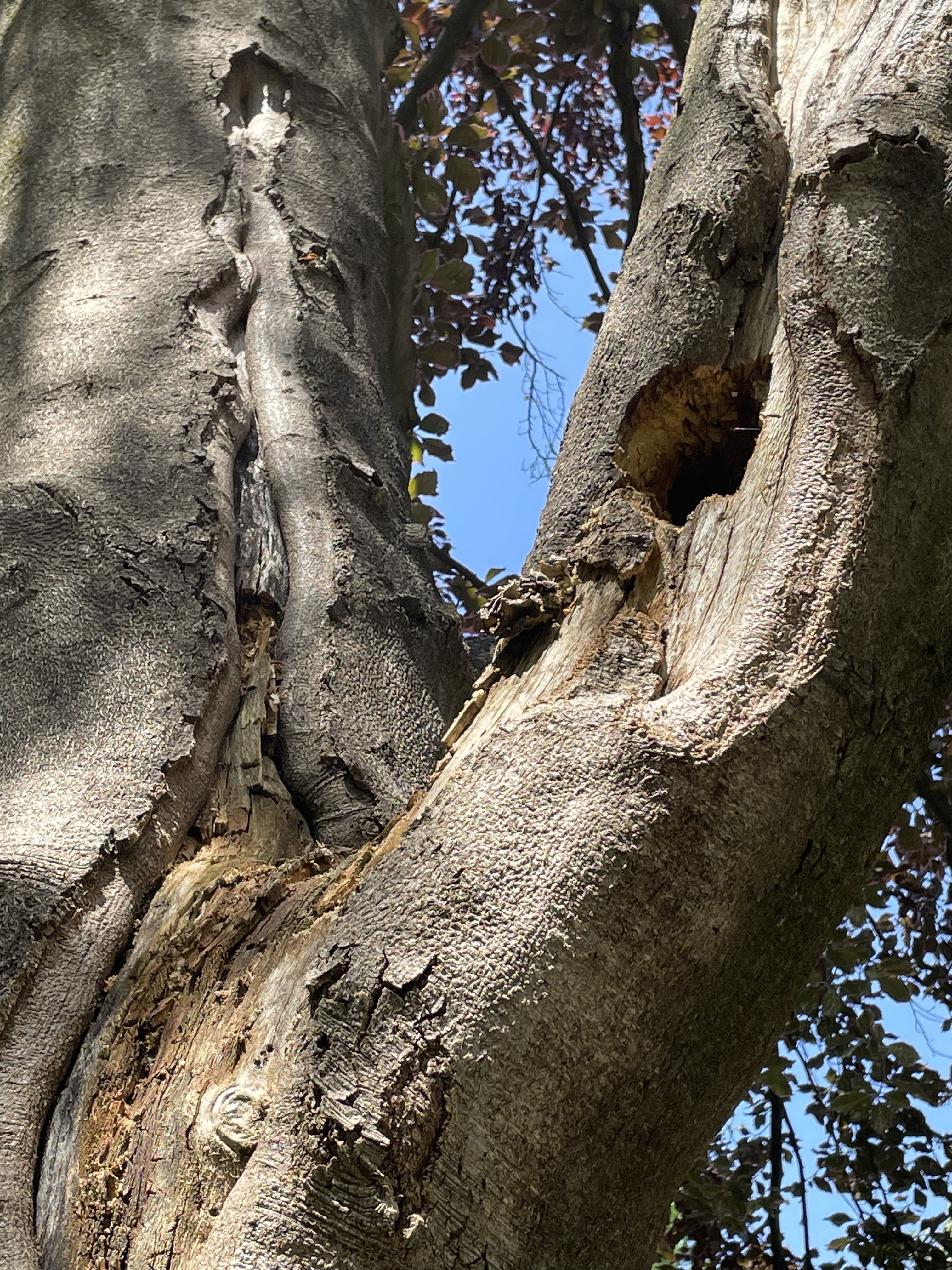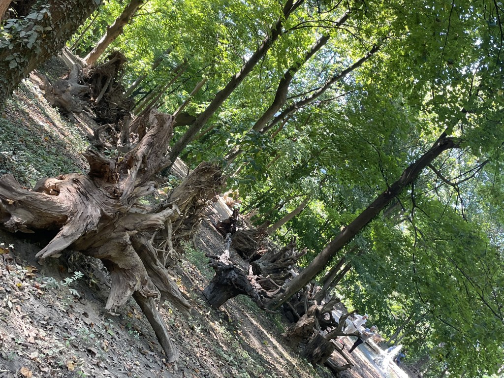Huge (of course), three stems, fantastic shaggy bark, spreading her roots all over the place as is her right. And a perfect place for posing schoolkids. Who shout “Save the Trees!” over their shoulders as they scamper away.