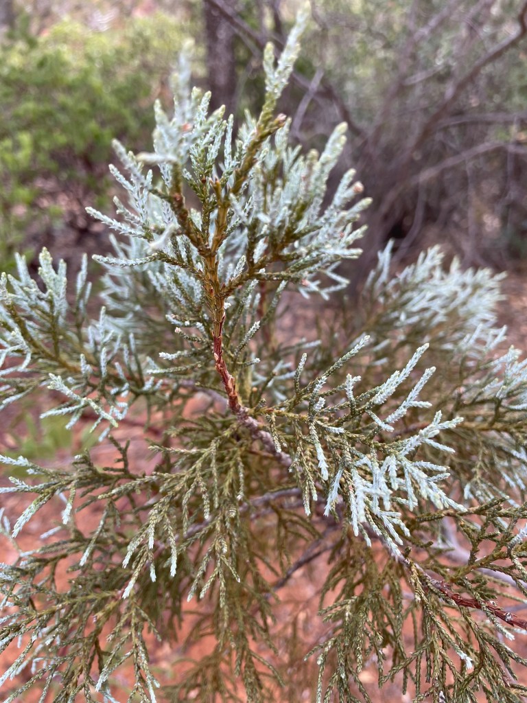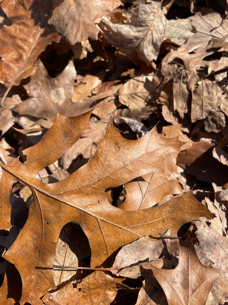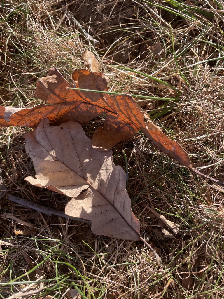 Wither the post oak? It’s a member of the white oak family, and all the trees in these woods have interbred for so long that I think any of them could be the oak in question. Though I cannot find the exact leaf, with its lobes that remind some of a Maltese cross, there are plenty of similar leaves.