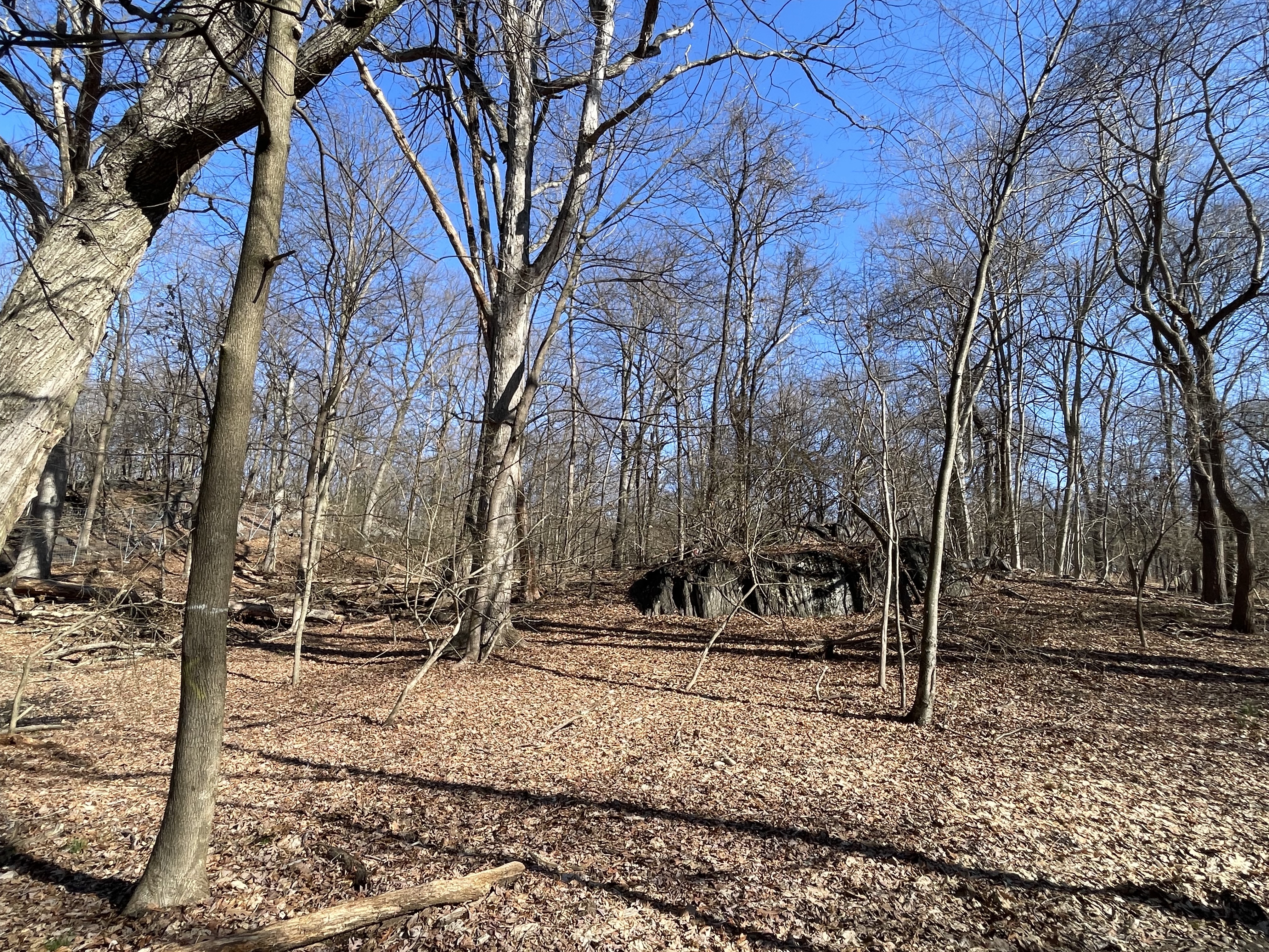 Now we venture to Ewen Park. I’ve never heard of the place, but I know there is a nominated cherry tree here “south of the dog run.” Tramping all over and unable to find it, we see some of the substantial rock formations that never got blasted away when much of New York City was originally leveled for development.