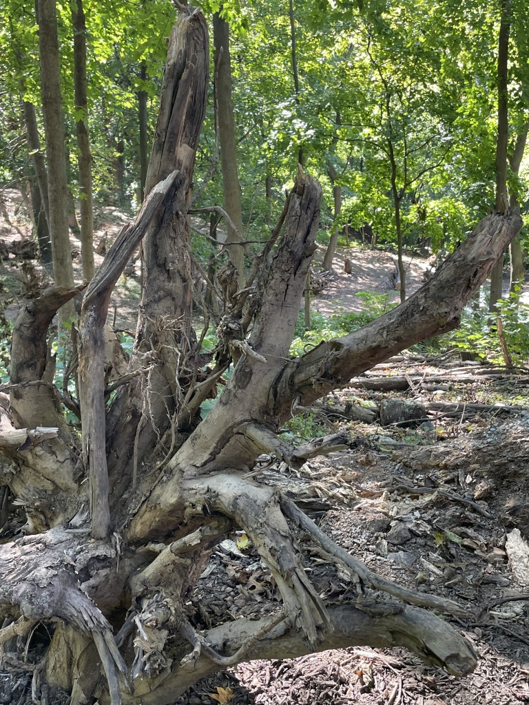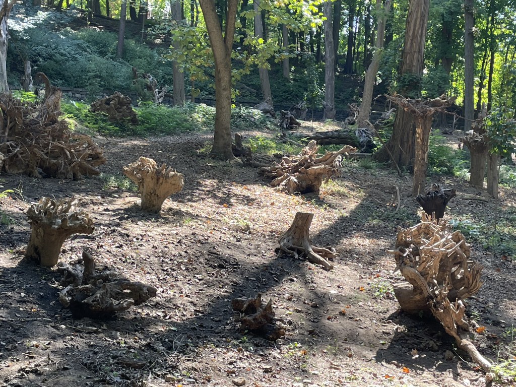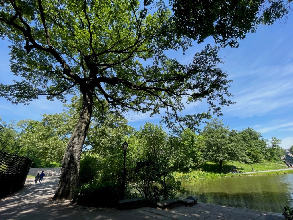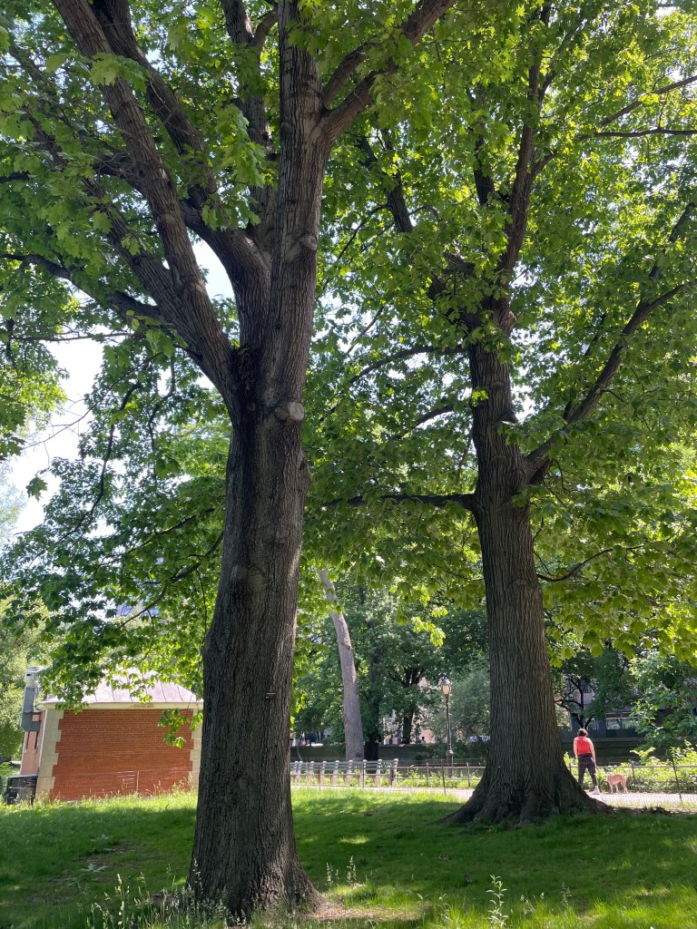 Perhaps the most beautiful tree I’ve ever seen. (And I’ve seen a few, so maybe just the most beautiful of the day. So far.) Then, we go elsewhere in the same park in quest of two hefty ashes that grow across a path from each other, seemingly competing for the Venus of New York prize. One is a marvel, yes. “This majestic Green Ash with a trunk size of 54″ is a gem and sits in the center of the pathway along passive lawn areas and rolling hills.”