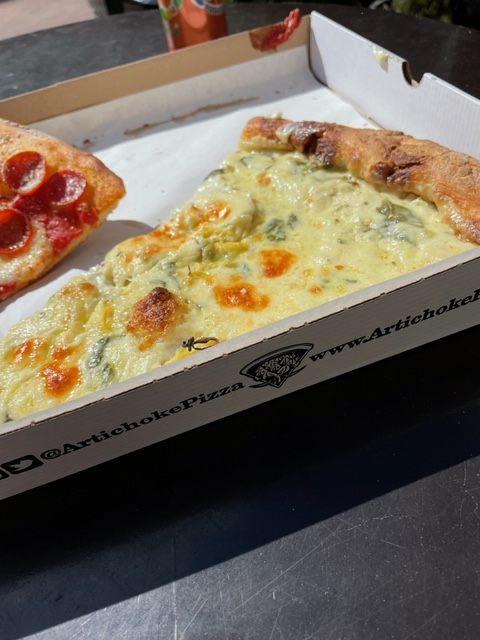 Coffee to cut the pizza at Artichoke Pizza, which weighs down Manhattan’s 14th Street’s east end with its cheesy, creamy, gooey goodness.