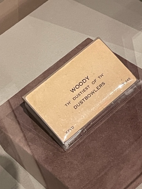There might be few Americans more antithetical in worldview as Woody Guthrie and J.P. Morgan. When most people think of J.P. Morgan, they might think, rapacious banker. Down in Wall Street you can still find the impression of explosive materials from when a horse-drawn wagon bombed J.P. Morgan & Co. bank in 1920 (killing 30 people though not the top guy). About Guthrie, on the other hand, people think, This Land is Your Land. And the song is here in spades, alongside dozens of notebooks, lyrics, photos and instruments. Even a business card.