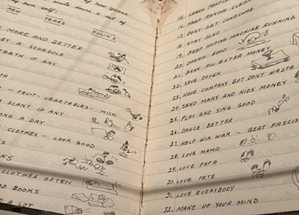 Seems like he put more demands upon himself than anyone, as per his New Year’s Resolutions for 1943. Along with Work more and better and Work by a schedule we find Write a song a day and Beat fascism. Beat fascism? And here I always say, Lose weight.