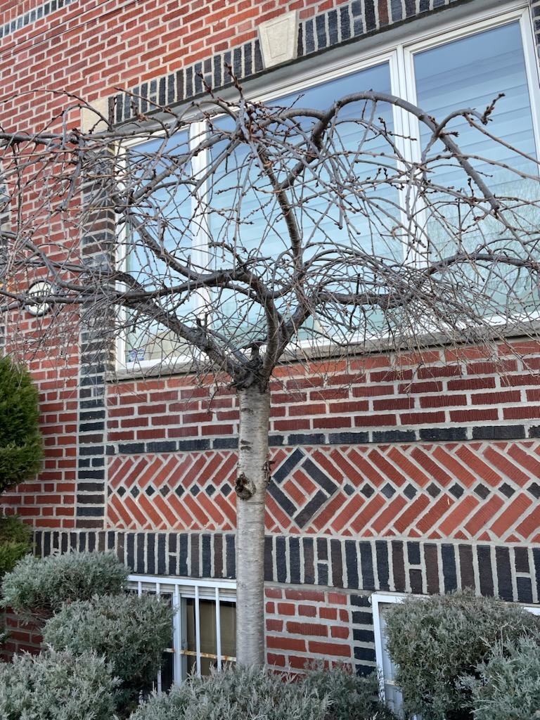 It occupies a tiny tree pit, 5×5, the base of its trunk flowing out to the edge of the pit, which was once carefully laid with Belgian blocks.