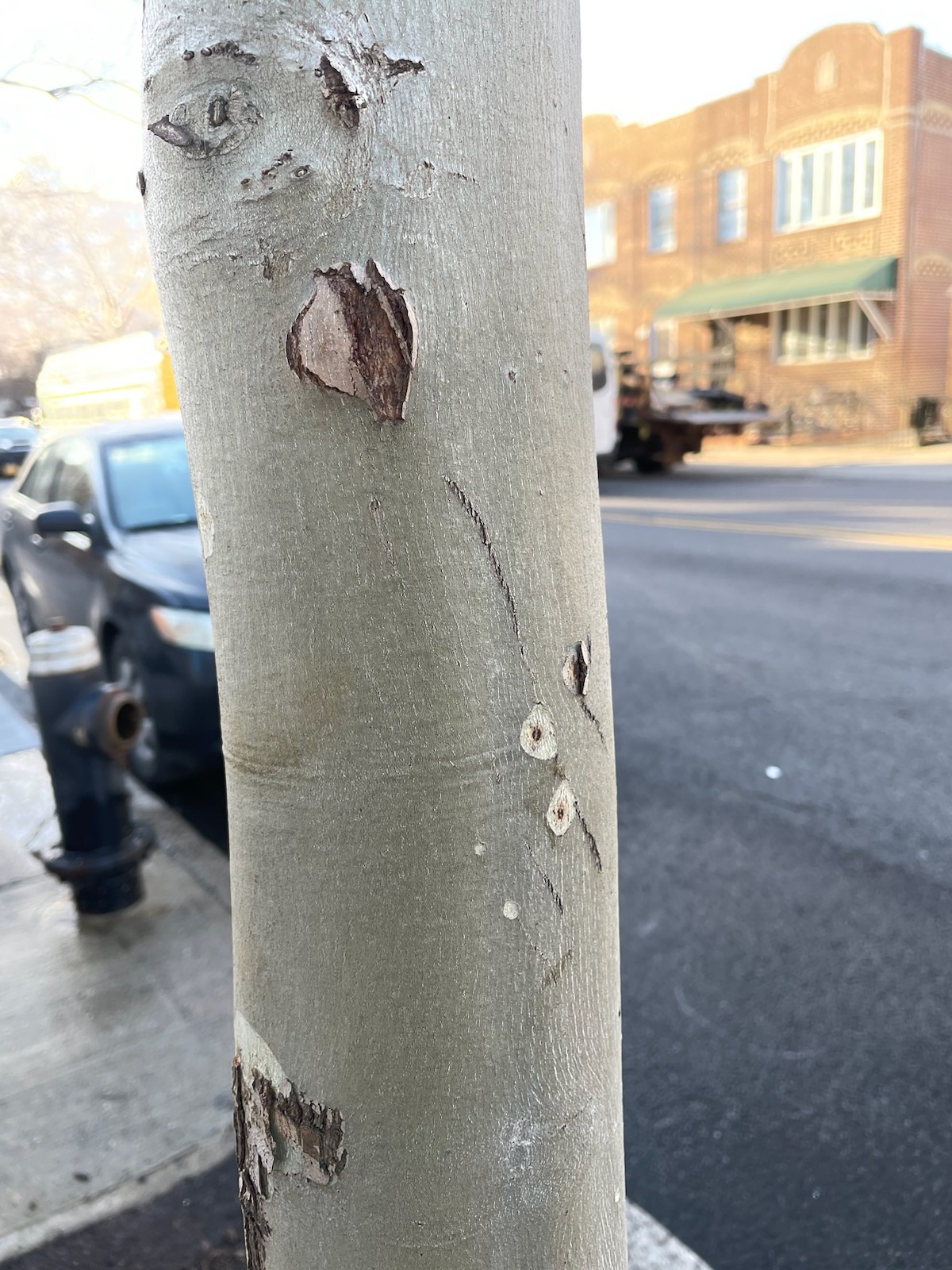 It occupies a tiny tree pit, 5×5, the base of its trunk flowing out to the edge of the pit, which was once carefully laid with Belgian blocks.
