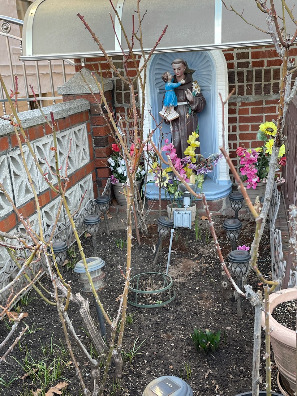 Edwina, let’s call this lovely specimen — gender fluid. Shading purple window-box flowers that glow beneath its canopy.