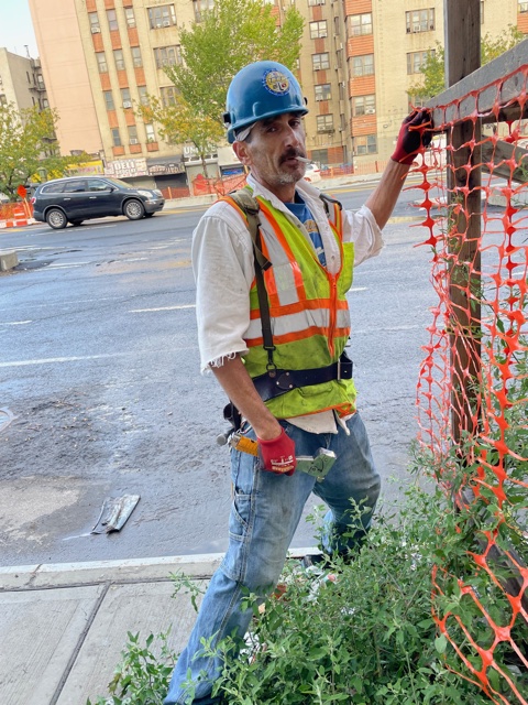 His job is exclusively to build and repair tree guards on the Grand Concourse construction site. He is, he told me, officially a carpenter by trade, as far as the union is concerned. That’s an honorable and well-paid profession. But we’re lucky to have him doing what he does. He squares up the enclosures and hammers the boards together, often standing back to scrutinize them before he starts to correctly gauge the tenor of the job.