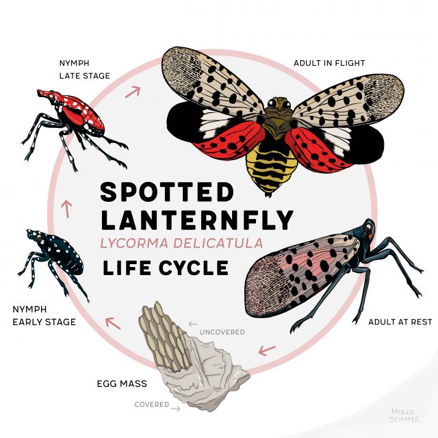 Norway maples, callery pear, ailanthus, ash. Spotted lanternfly adores laying its disgusting eggs on the bark of the ailanthus, commonly known as the tree of heaven.