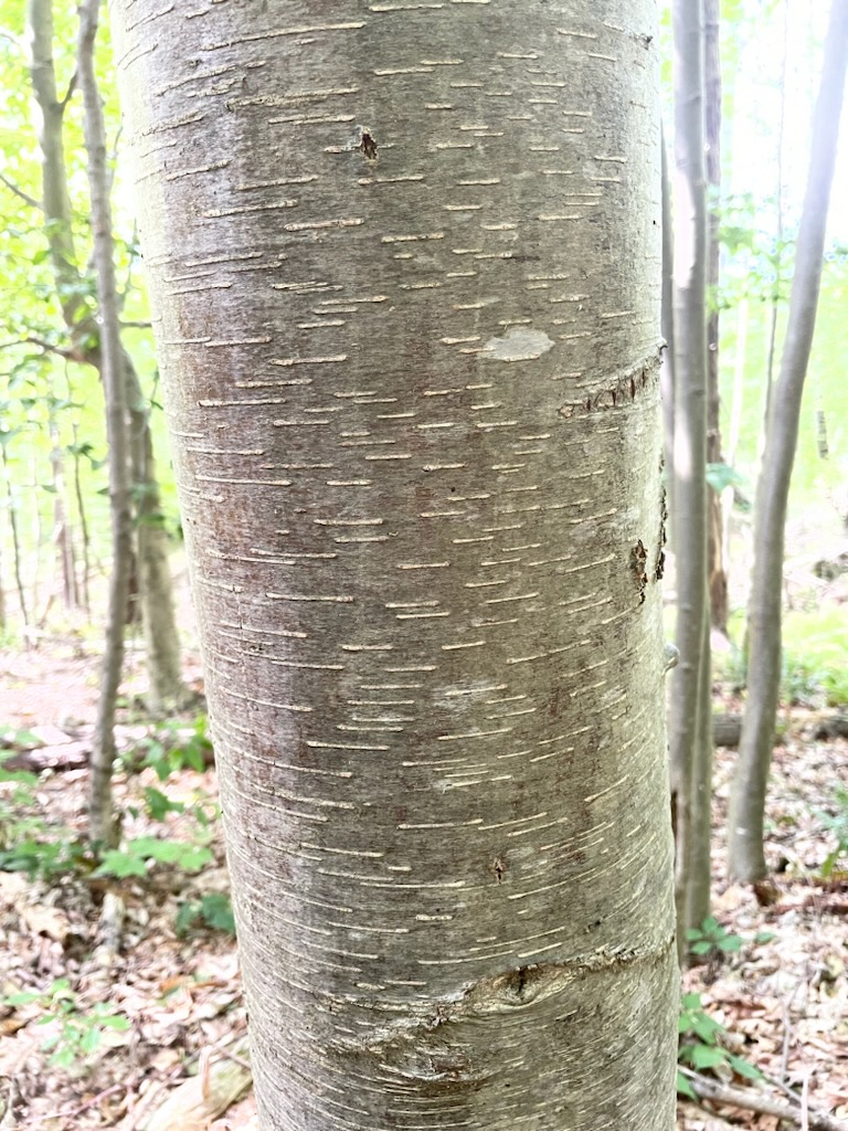 A trail takes us through groves of sweet birch.