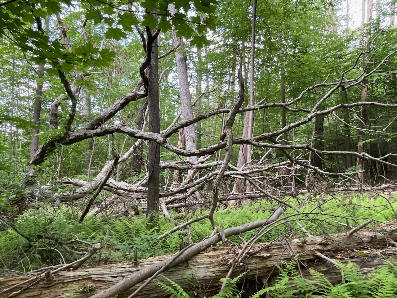 Of course, that more than whets my appetite to find this spectacular tree. But it’s not easy. Entering the park, we find massive white oaks and scarlet oaks. This is a mast year, and all around the ground is carpeted with acorns that crunch underfoot.