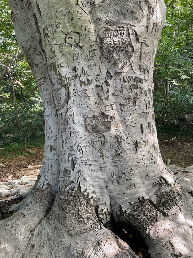 Some tree folks don’t like these autobiographical messages on beech bark, opining that the practice of carving disrupts the tree’s vascular system. But look at the health of this tree, probably two hundred years old. I like the engraved graffiti, because to me it proves people’s strong, abiding connection with trees.